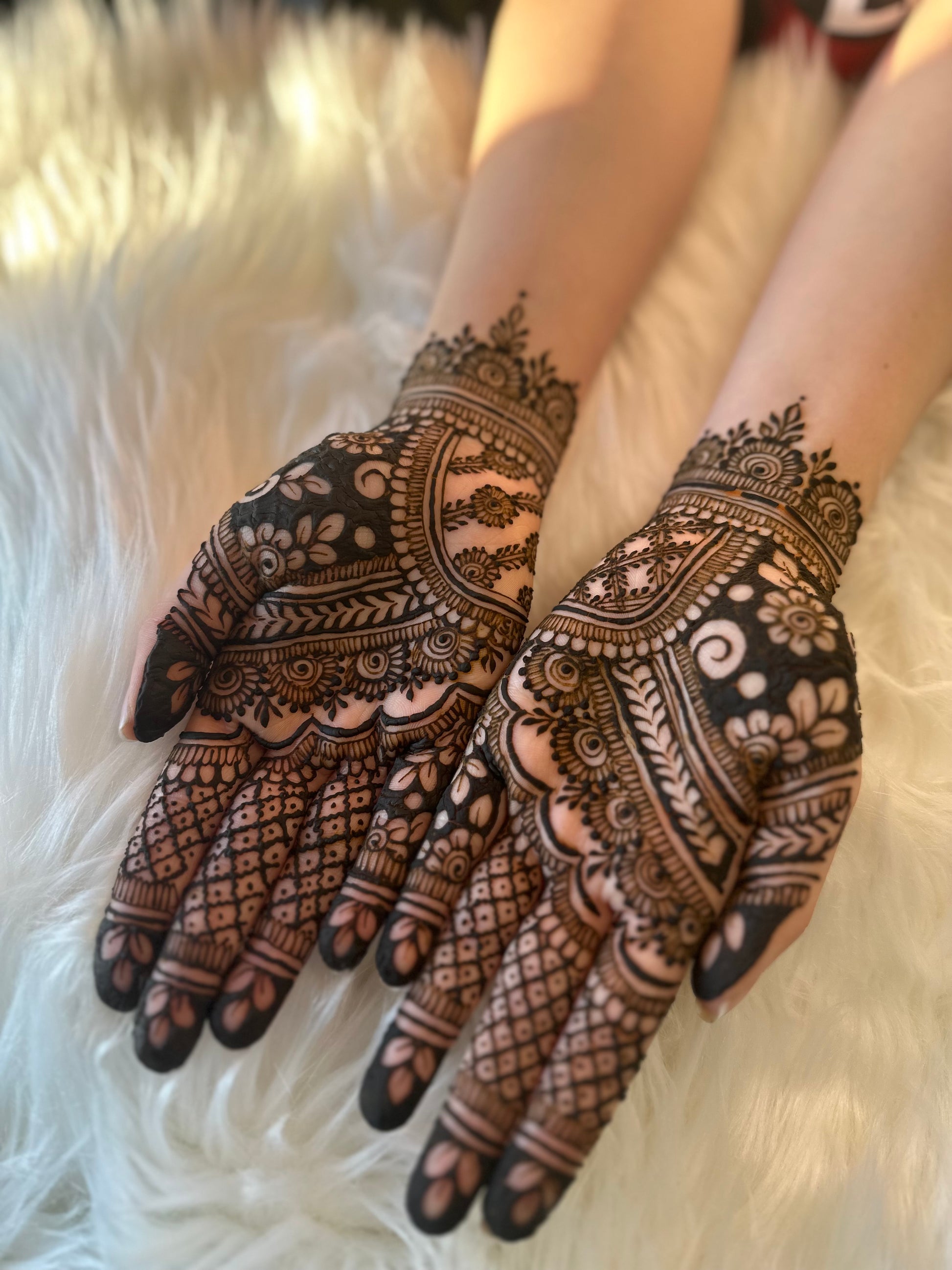 Enjoy an intricate full bridal henna session (both hands front and back).